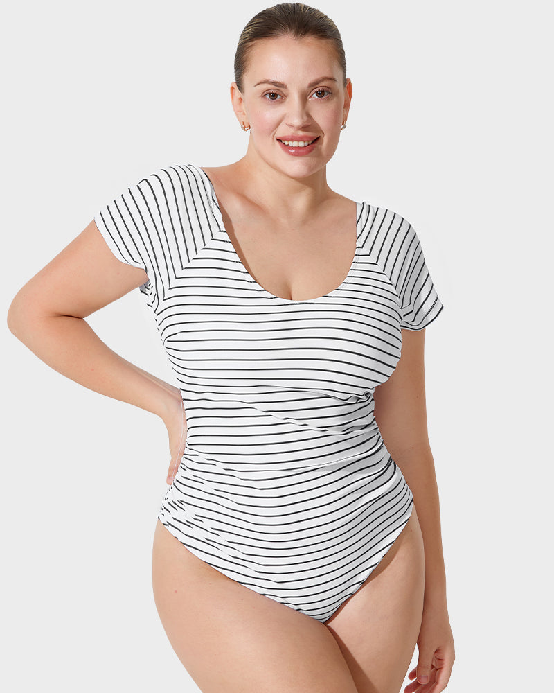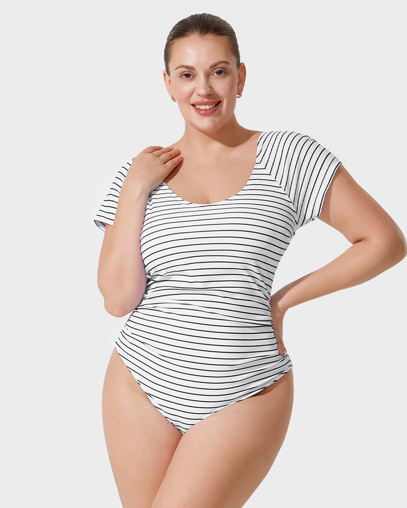 Scoop Neck Short Sleeve Stripes Modest One-Piece Swimsuit