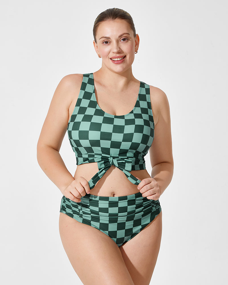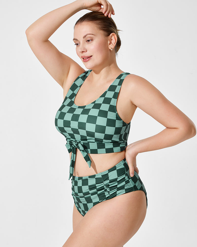 Green Checkered Knot Crop Top Bikini Set with Shorts (3-Piece Set)