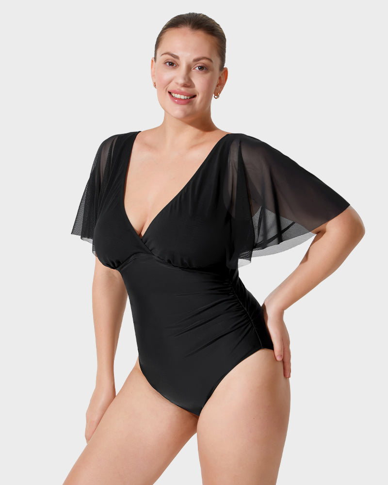 Deep V Mesh Ruffle Sleeve One-Piece Swimsuit