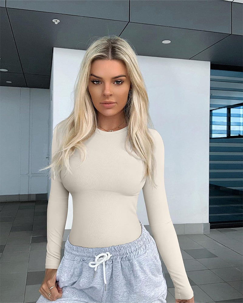 Long Sleeve Ribbed Fitted Top with Built-In Bra