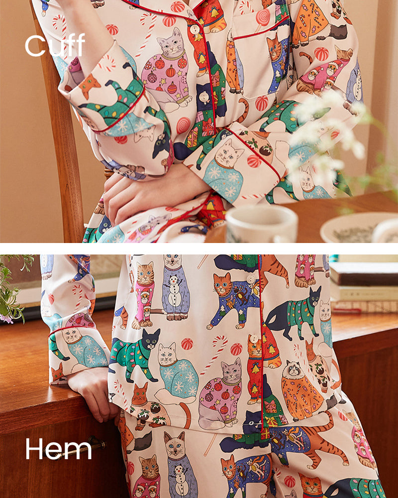 Introducing the Christmas Cat Print Long Sleeve Satin Pajama Set, a whimsical and cozy option for cat lovers celebrating the festive season. This charming pajama set combines playful design with luxurious comfort, perfect for holiday lounging.