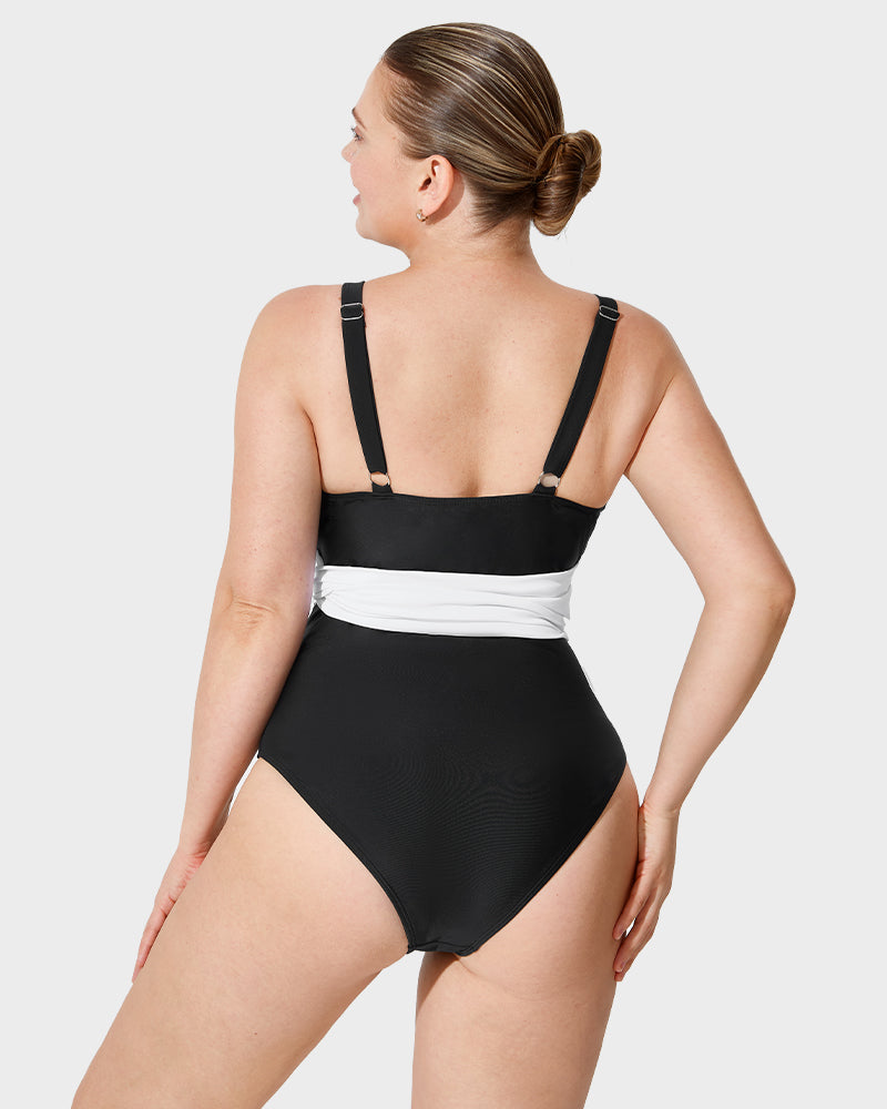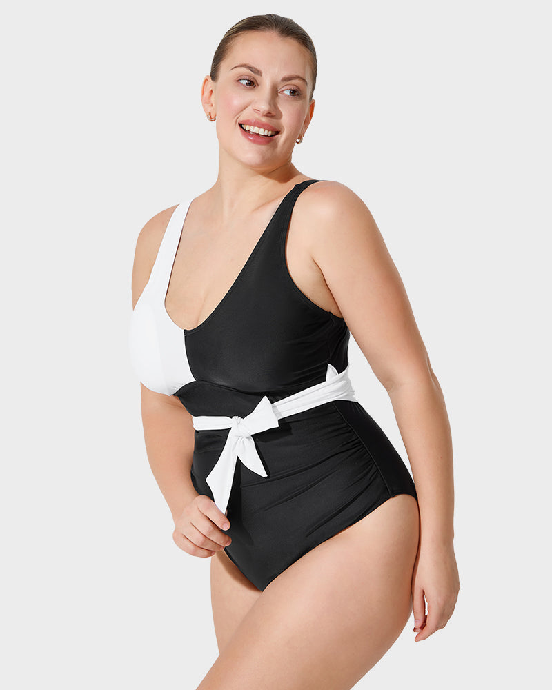 The bold color-blocking creates a modern and dynamic look, ensuring you stand out in any water setting.Flattering Belted Waist