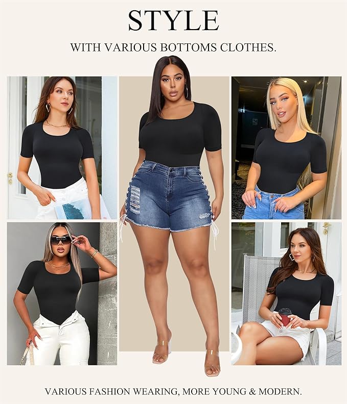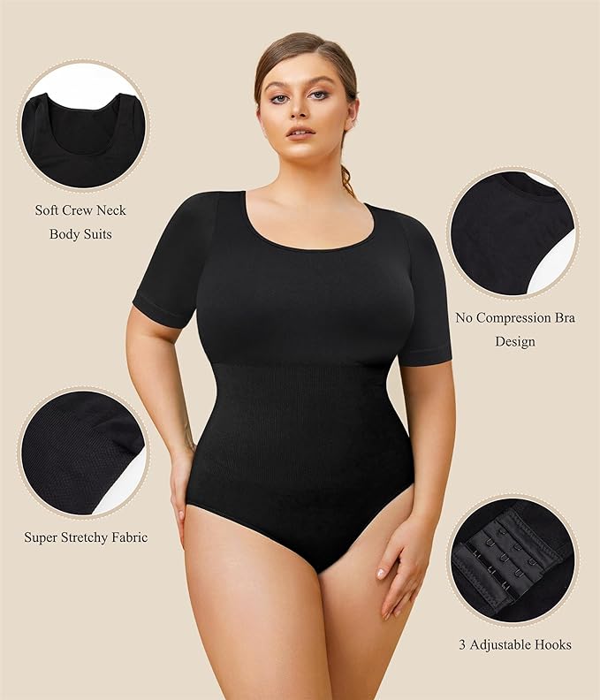 Sculpting Perfection: This round neck t-shirt bodysuit hugs your figure with a smooth, seamless silhouette, expertly accentuating your curves and enhancing your natural beauty.