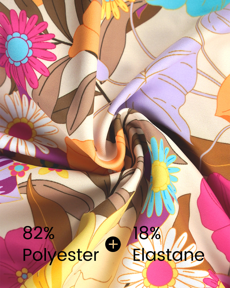 The vibrant floral print brings a fresh and lively vibe, perfect for embracing the spirit of summer.Flattering Fit