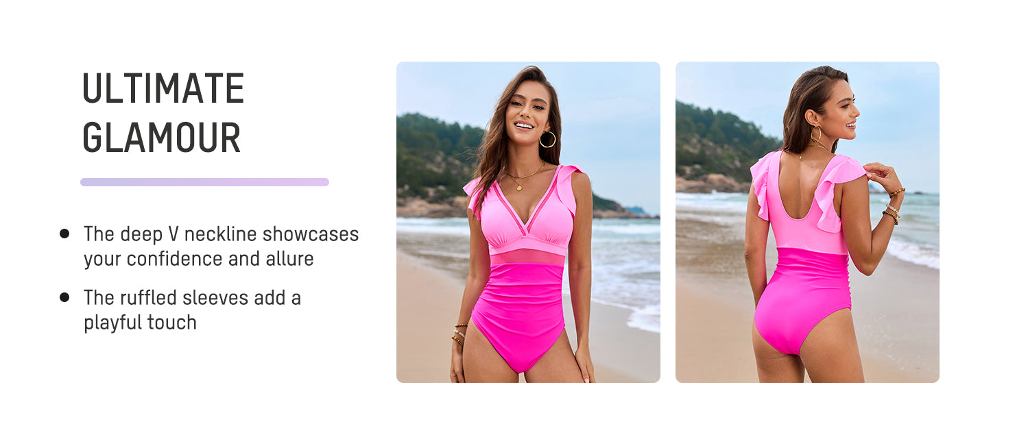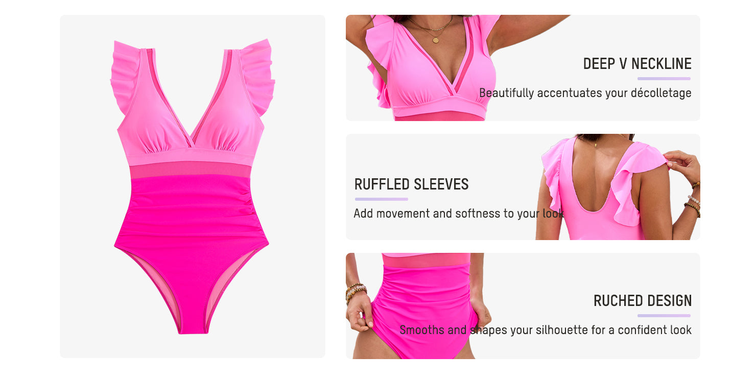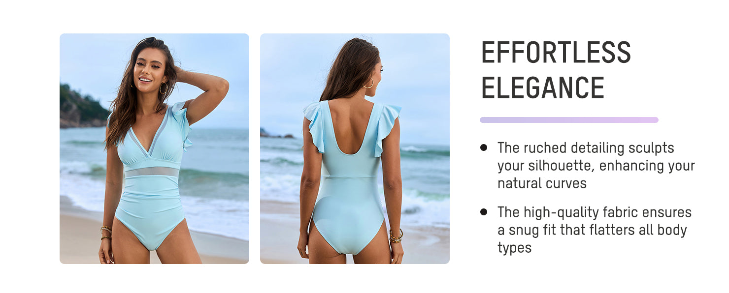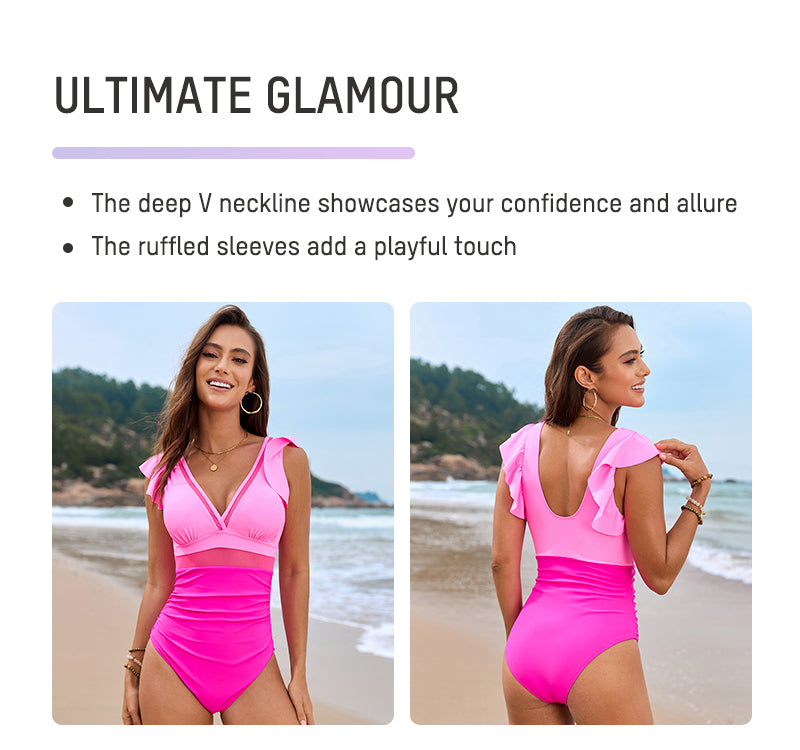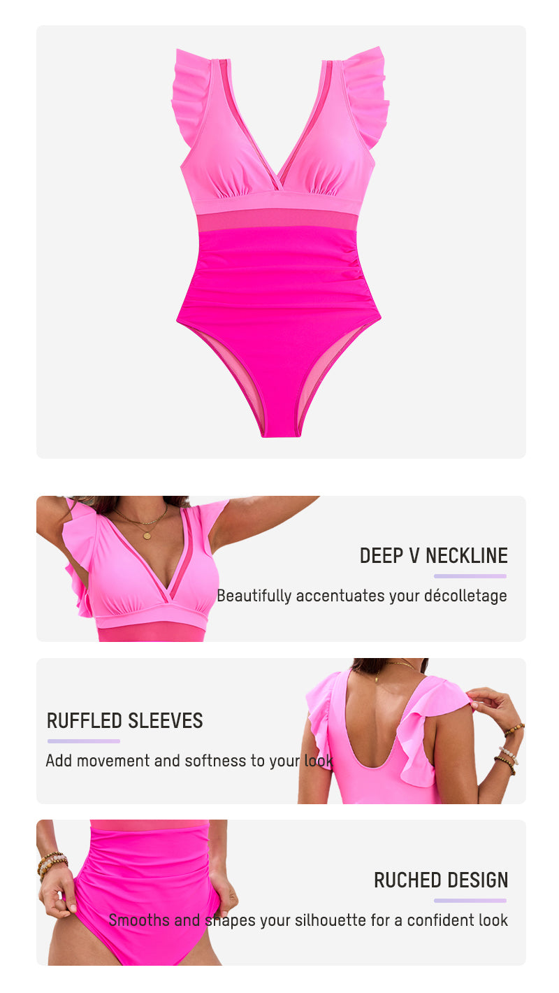 Deep V Ruffled Sleeve Mesh Panel Ruched Swimsuit