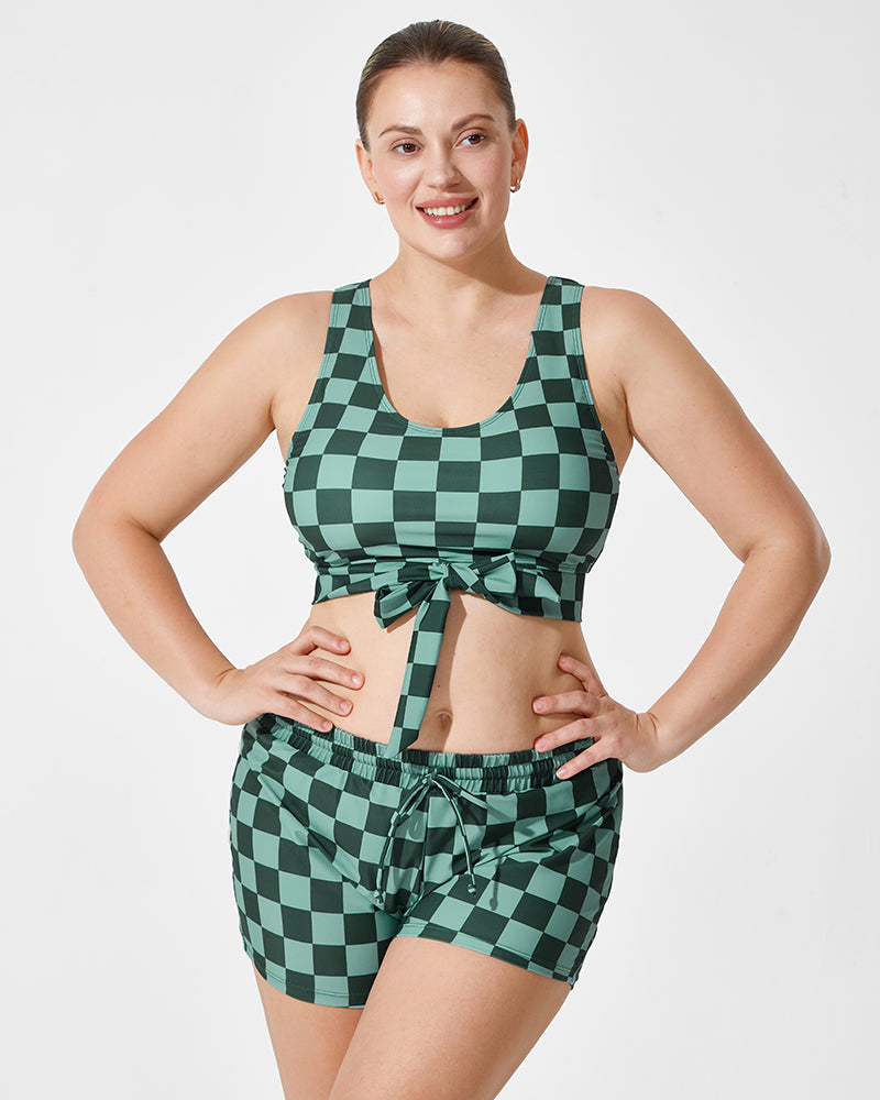 Introducing the Green Checkered Knot Crop Top Bikini Set with Shorts, a fun and stylish 3-piece swimwear ensemble perfect for all your summer adventures. This set includes a trendy crop top, classic triangle bikini bottoms, and comfortable shorts, making it ideal for beach days, pool parties, or casual outings.