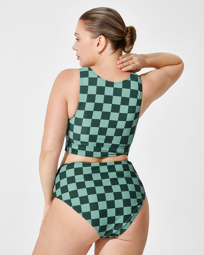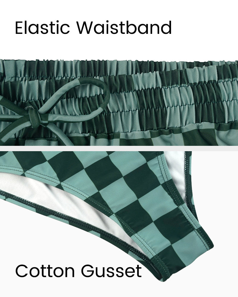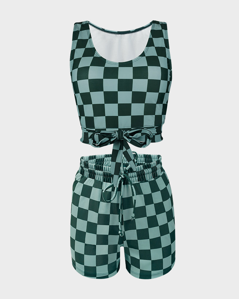 The matching shorts provide additional coverage and versatility, allowing you to transition easily from water activities to beach strolls.Playful Checkered Pattern