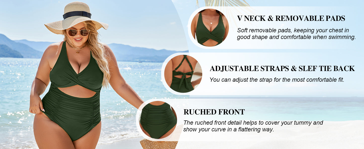 - Feature: Women's Slimming swimsuits feature with a sexy v neck, cutout design on front and back, adds a feminine style to this swimsuit. The adjustable spaghetti straps and criss cross self tie back are designed to adjust the swimsuit to the most comfortable fit.